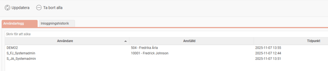 Under fliken Användarlogg kan du se vilka användare som just nu är inloggade i Flex HRM.