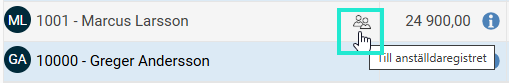 Eftersom alla uppgifter om en anställd inte visas i lönerevisionen finns det en genväg för att enkelt se all information. Du öppnar anställdaregistret genom att klicka på den anställdes namn i listan.