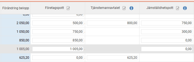 I exemplet nedan får anställd nr 1 500kr från den generella "Företagspott", 800 kr från potten "Tjänstemannaavtalet" samt 750kr från "Jämställdhetspott". Totalt innebär det en höjning för den anställde på 2050kr.