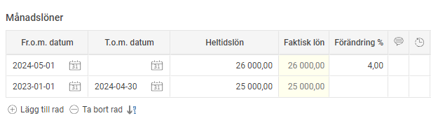 Observera att om den nya kommande lönen efter lönerevisonsdatumet också ska höjas så måste det hanteras manuellt i anställdaregistret.