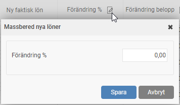 Klicka på ikonen i kolumnrubriken för Förändring % eller Förändring belopp för att ange ett värde som ska gälla för alla anställda som för närvarande visas i listan. Använd filtret om du vill applicera detta på en specifik grupp.