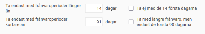| Endast frånvaro längre än X antal dagar: Om du ställer in att endast perioder längre än exempelvis fjorton dagar ska tas med, kommer hela frånvaroperioden att räknas in. En frånvaroperiod på trettio dagar kommer alltså att räknas med i sin helhet. |