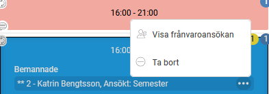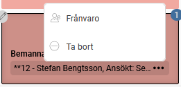 Ansökt frånvaro som ännu inte har behandlats markeras med två asterisker (**). Du kan klicka på de tre prickarna för att öppna frånvarohanteraren och behandla ansökan. Du kan också klicka på de tre prickarna för en bemannad anställd för att öppna frånvarohanteraren och registrera en ny frånvaro. |
