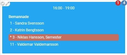 | I vyn Arbetspass visas frånvaro med rött, under förutsättning att du har valt att visa bemannade anställda via Mer > Inställningar. | ![]() |