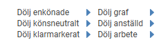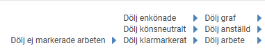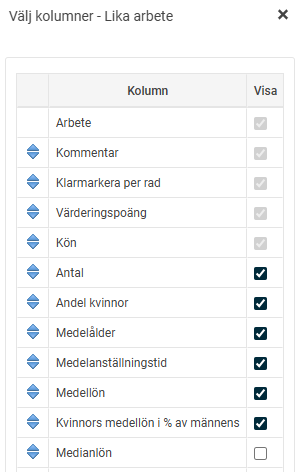 I denna vy behöver, enligt lag, inte enkönade arbeten analyseras vilket gör att sådana arbeten kan döljas i vyn. Som hjälp för att kunna fokusera på just den information du behöver i din analys av lika arbeten kan du välja på nedan högst upp till höger i vyn: