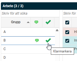 Utöver att klarmarkera en hel vy kan du välja att klarmarkera varje grupp för sig. Denna kolumn visas alltid men är inget krav för att få klarmarkera hela vyn. Syftet är att det ska kunna vara ett stöd i vad du gått igenom och inte.