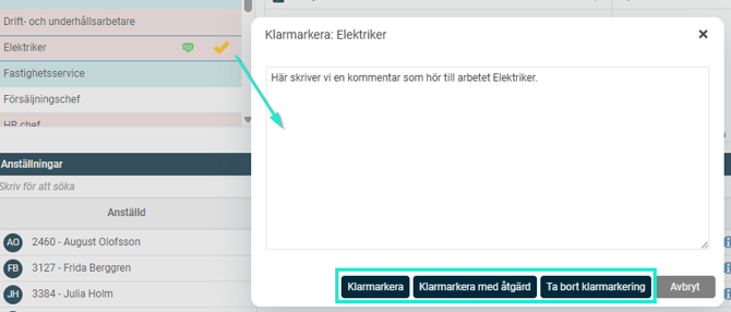 Klarmarkera genom att välja Klarmarkera eller Klarmarkera med åtgärd (klicka på bocken som dyker upp när du hovrar i kolumnen). Du kan även skriva en kommentar t.ex. till vad för åtgärd som behöver vidtas. Grön bock betyder att arbetet är klarmarkerat men inte kräver någon åtgärd och gul bock betyder att arbetet är klarmarkerat men kräver en åtgärd.