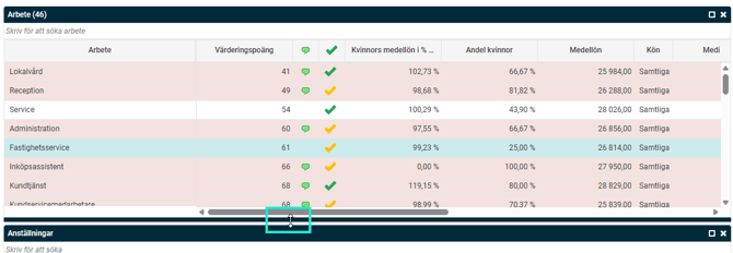I denna vy ska du, med hjälp av den data som presenteras, analysera en grupp åt gången. Varje grupp innehåller två eller flera likvärdiga arbeten, dvs. arbeten som fått nästan samma värderingspoäng och därmed anses ha lika värde utifrån den arbetsvärdering som gjorts. Det kan alltså vara olika arbetsuppgifter i de olika arbetena i en grupp men arbetena ställer likvärdiga krav på de anställda utifrån kriterier som ansvar, ansträngning, arbetsförhållanden, kunskap och färdigheter.