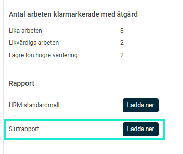 Slutrapporten innehåller bland annat alla arbeten inklusive värderingspoäng, sammanställningar av lika och likvärdigt arbete samt en åtgärdsplan. Där det saknas data i aktuell lönekartläggning lämnas det avsnittet tomt i det nedladdade dokumentet. Den laddas ner som ett Word-dokument så att du själv kan fylla på med och redigera det du själv vill och behöver.