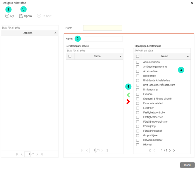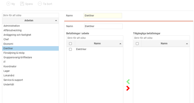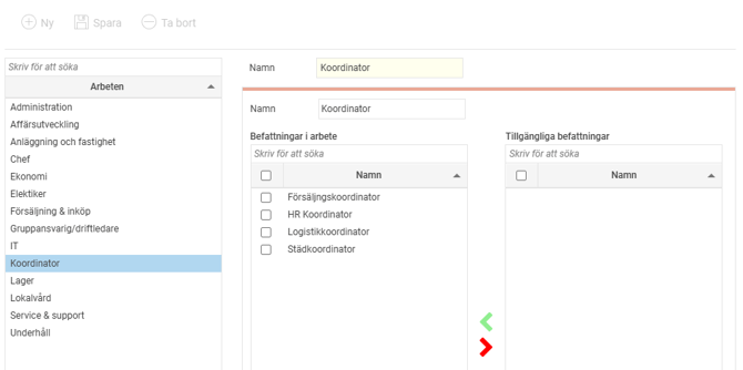 - Klicka på den gröna pilen för att lägga till dem i kolumnen för Befattningar i arbete. Om du råkar lägga till en befattning för mycket i ett arbete markerar du det bara och klickar på den röda pilen för att få det tillgängligt för ett annat arbete istället.