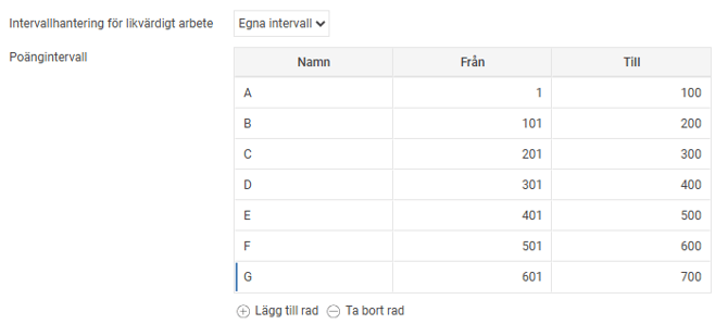 När du använder procent förhåller sig lönekartläggningen till maxpoängen i faktorplanen. Är faktorplanens maxpoäng 640 med inställning på 3%, anses ett arbete likvärdigt ett annat arbete om det ligger inom 19 poäng. - För egna intervall kan du själv bestämma hur stora och hur många intervall du vill använda för just era likvärdiga arbeten genom att lägga till rader. Döp varje grupp och ange vilket poängintervall som gäller.