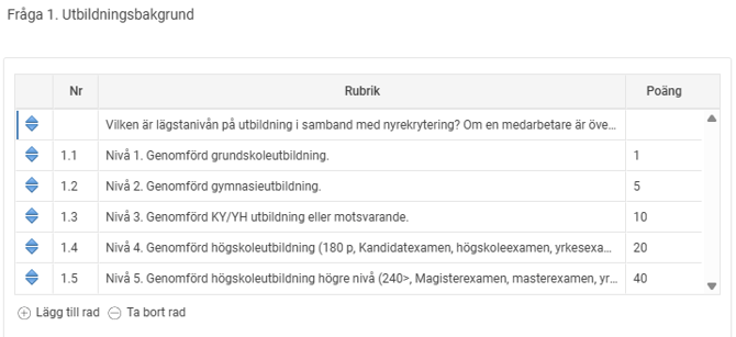 Har du redan en färdig arbetsvärdering? Då kan du själv ange aktuell poäng per arbete här antingen manuellt eller via filimport. Detta är användbart om du t.ex. använder ett befintligt system för arbetsvärdering som t.ex. BAS eller BESTA. Detta alternativ innebär att ingen arbetsvärdering görs i HRM vilket gör att fliken Arbetsvärdering utgår.