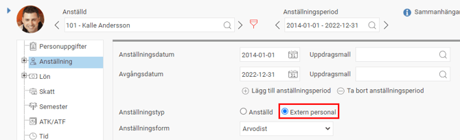 Observera att anställningstyp Extern personal även påverkar andra funktioner i HRM såsom till exempel Payroll och viss statistik.