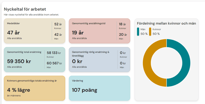 Granska statistiken: Du ser nu medellöner för kvinnor respektive män inom arbetet, samt den procentuella skillnaden i lön.