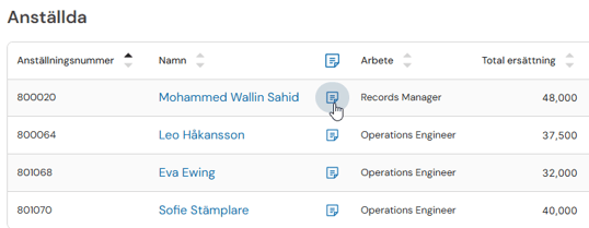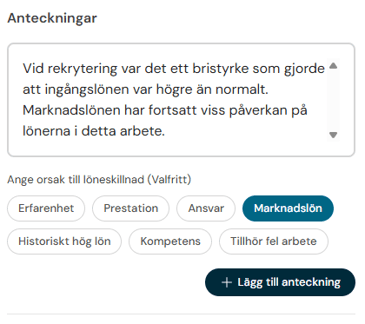 Om du upptäcker en löneskillnad mellan arbeten behöver du analysera om den är saklig. Granska individerna i listan för arbetet för att göra din analys av lönerna och klicka på Anteckningar för att anteckna din analys för aktuell anställd.