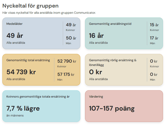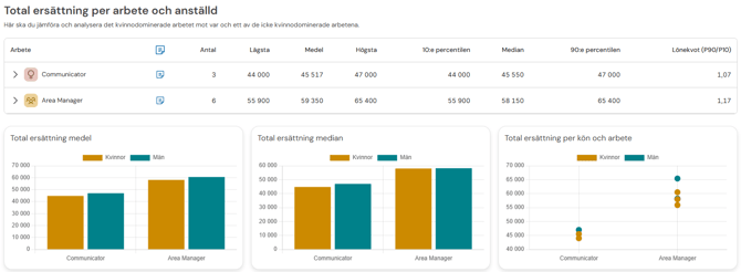 I den här vyn gör vi en kontroll över de olika poängnivåerna. Vi jämför kvinnodominerade arbeten med arbeten som inte är kvinnodominerade och som har lägre krav. Det här är en viktig del i vår HRM-lösning för att upptäcka strukturella löneskillnader som kan bero på att vissa yrken historiskt sett har värderats för lågt.