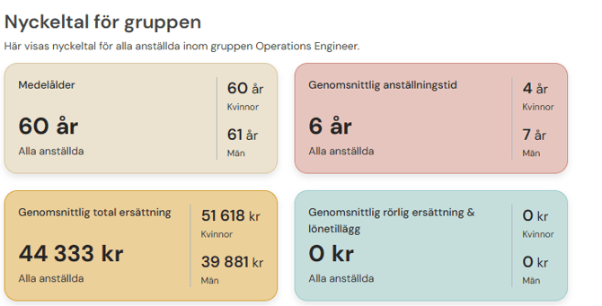 Nyckeltal för grupperna: Här ser du en sammanställning av medellönerna för kvinnor och män inom hela gruppen.