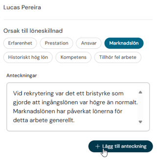 Om du upptäcker en löneskillnad mellan likvärdiga arbeten behöver du analysera om den är saklig. Klicka dig ner på individerna i listan för arbetet för att göra din analys av lönerna och klicka på Anteckningar för att anteckna din analys för aktuell anställd.