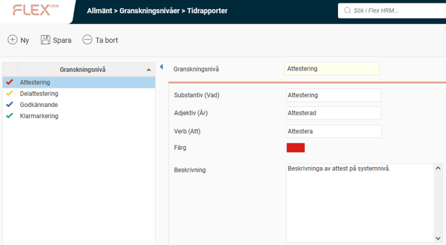 I listan till vänster visas de granskningsnivåer som finns upplagda i systemet. I vår exempelversion för granskning av tidrapporter har fyra granskningsnivåer lagts upp, men vi kommer endast att använda tre som exempel: Klarmarkering, Godkännande och Attestering. Antalet nivåer som läggs upp och vilka benämningar som används för dessa är dock helt valfritt.