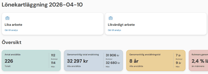 Gemensamt för alla analysvyer är att vi presenterar statistiken i tydliga nyckeltal, tabeller och grafer. Syftet är att hjälpa dig att snabbt identifiera var det finns löneskillnader mellan kvinnor och män och avgöra om dessa är sakliga eller inte.