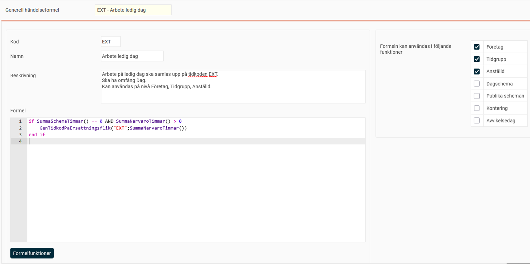 I exemplet ovan finns en generell händelseformel som ska summera tid arbetad på ledig dag på tidkoden “EXT”. Denna formel ska gå att använda på företags-, tidgrupps- och anställdnivå.