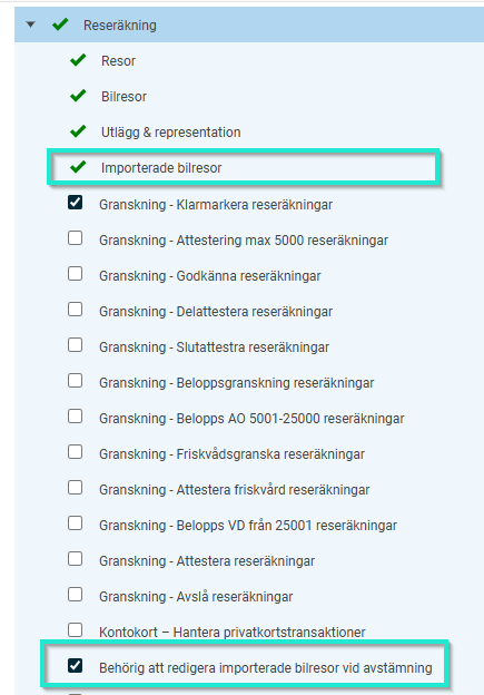 För att kunna använda den här funktionen behöver du en medarbetarroll med rätt behörighet för importerade bilresor. För den här rollen kan du även välja om du ska kunna redigera de importerade bilresorna vid en avstämning.