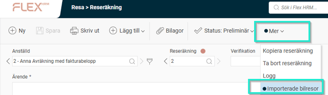 Behöriga användare får ett nytt alternativ under menyn Mer för att stämma av importerade bilresor.
