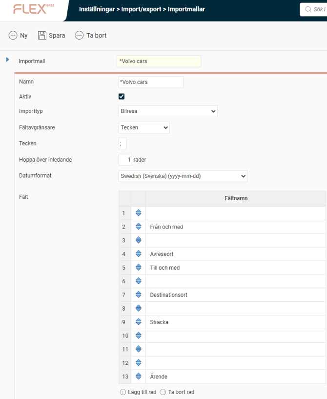 För att kunna importera körjournaler från en textfil måste du först skapa en importmall som beskriver filens format.