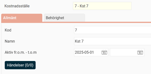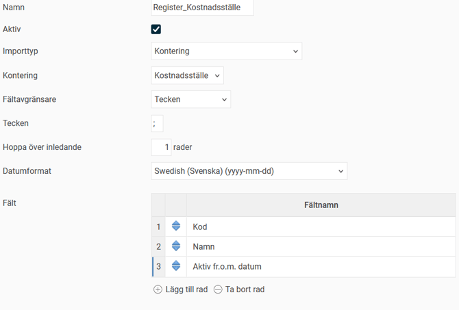 För att importera nya kostnadsställen kan vi skapa du en importmall som innehåller kod, namn och aktiv från och med-datum.