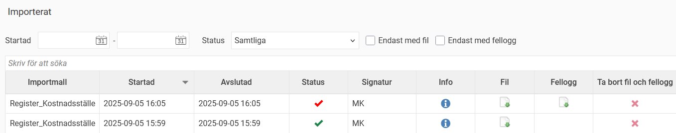 Visa logg: Detaljer om importen, som när den startade och avslutades samt eventuella fel. Om något har gått fel, hittar du en fellogg som informerar om vilka rader som inte kunde importeras och varför.