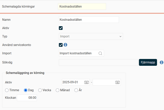 Du kan schemalägga en sparad import så att den körs automatiskt vid en viss tidpunkt.