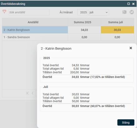 Panelen är sorterad efter övertidsvärdet för det aktuella året. De anställda med mest övertid visas då överst. Du kan ändra sorteringsordningen genom att klicka på de olika rubrikerna. Månads- och årssummorna räknas ut fram till dagens datum.