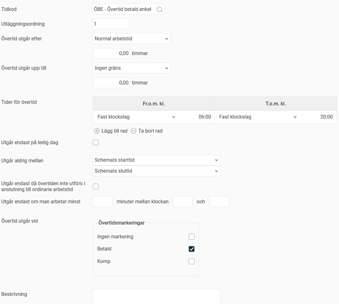 Börja med att ställa in vilka övertidsmarkeringar som ska användas i regelverket, till exempel Betald och Komp. Dessa markeringar blir sedan valbara i tidrapporten.