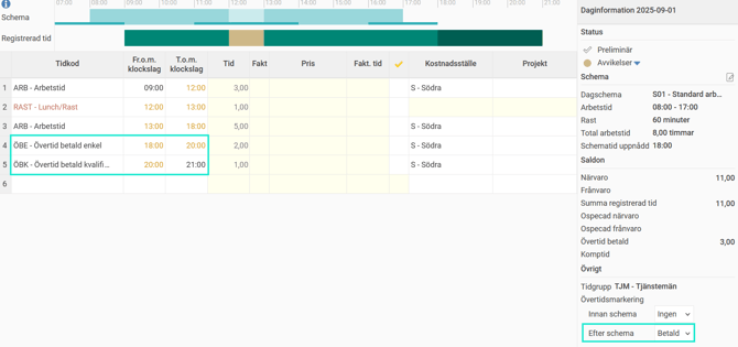 Är du schemalagd åtta timmar, kl. 08:00-17:00, och registrerar arbetstid + övertidsmarkering 09:00-21:00 faller ÖBE ut 18:00-20:00 och ÖBK 20:00-21:00.