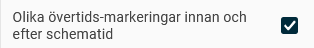 På dagar med arbetstid finns möjlighet att använda olika övertidsmarkeringar för övertid före och efter arbetstid. Denna inställning heter Olika övertids-markeringar innan och efter schematid och kan göras på företags-, tidgrupps- eller anställdnivå. Det kan vara användbart om du till exempel vill ha betalt för övertid som arbetats före schemat, men komp för övertid efter schemat.