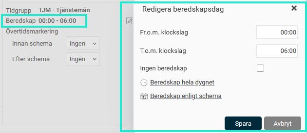 I tidrapporten ser man tiderna för beredskap i kolumnen Daginformation. Användare med behörighet att redigera beredskapsdag kan där öppna en popup för att ändra tider för enskilda dagar