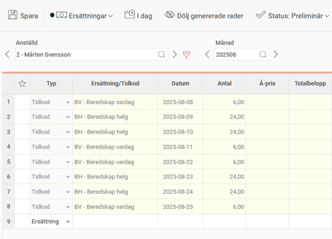 När beredskapen genereras under Ersättningar kan du välja om den ska genereras per datum eller summeras ihop för hela perioden.