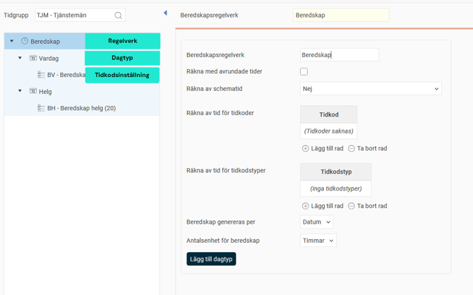 Under Beredskapsregelverk skapas beredskapsregelverk per tidgrupp. Regelverket skapas i tre nivåer: Regelverk, dagtyp, tidkodsinställning. På bilden nedan har vi regelverket Beredskap, dagtyperna Vardag och Helg samt tidkodsinställningarna BV och BH.
