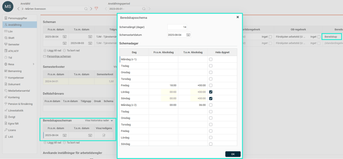 För att den anställde ska ha beredskap i sitt schema måste du också schemalägga det. Det gör du på samma flik, under Beredskapsscheman. Här talar du om hur beredskapen ska schemaläggas, t.ex. varannan vecka, och fr.o.m. vilket datum den anställde ska följa beredskapsschemat.