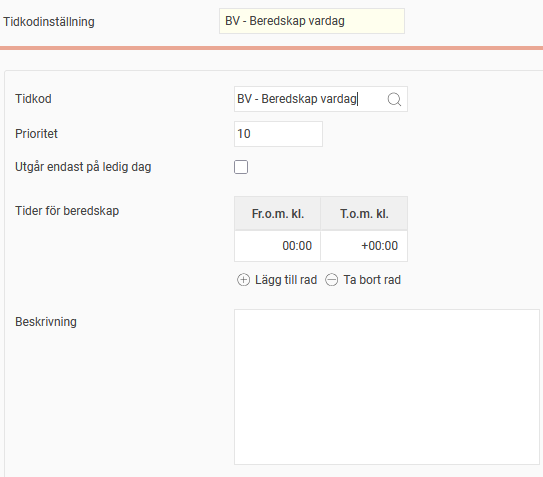 På nivån Tidkodsinställning anger du vilka tidkoder som ska gälla baserat på klockslag. På bilden nedan är BV inställd på att falla ut hela dygnet, men man skulle t.ex. kunna ha en regel för en tidkod som ska falla ut 00:00-06:00 samt 18:00-24:00 och en regel för en annan tidkod som ska falla ut 06:00-18:00.