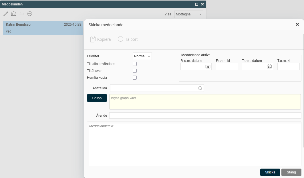 Meddelande aktivt Denna funktion visas bara för de användare som har behörighet att skicka schemalagda meddelanden. Här kan du ange ett från och med-datum och klockslag samt ett till och med-datum och klockslag som meddelandet ska visas. Meddelandet skickas då till de valda mottagarna på det valda från och med-datumet och raderas automatiskt på till och med-datumet. Detta är användbart för att till exempel undvika att användare som återvänder från tjänstledighet får gamla meddelanden.