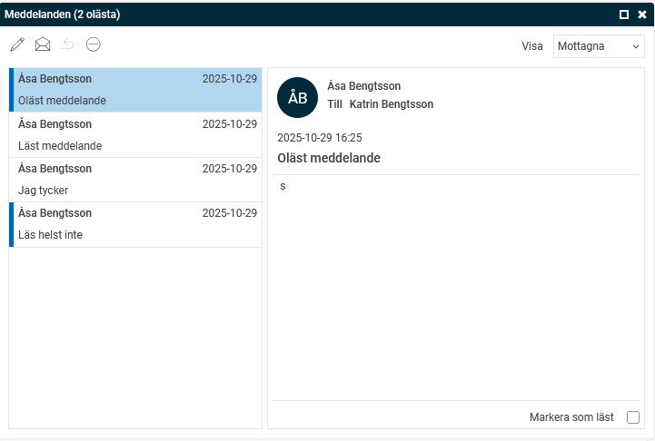 När du filtrerar på mottagna meddelanden markeras olästa meddelanden med en rand i vänsterkanten.