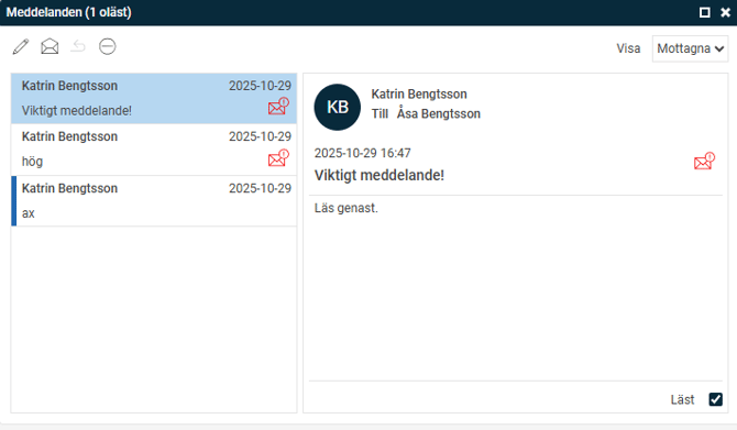 För att markera ett meddelande som läst när det visas till höger, bockar du i Markera som läst. Texten ändras då till Läst. Du kan bocka ur rutan igen om du vill att meddelandet ska markeras som oläst.