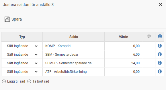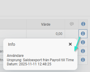 Genom att klicka på den pratbubblan kan du ange/visa eventuella kommentarer gällande saldojusteringen. Genom att klicka på informations-ikonen till höger får du upp information om vilken användare som gjorde den, vilken tidpunkt den gjordes samt ursprung. Ursprunget kan vara antingen Manuell, om en användare lagt in raden manuellt i HRM, Import, om saldojusteringen importerats eller saldoexport från Payroll till Time om exporten kommer från lönesystemet.
