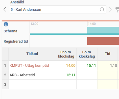 Ditt schema är 8:00 – 17:00. Du önskar stämpla ut klockan 13:30 för kompledighet resten av den aktuella dagen. Då kan du stämpla frånvaro aktuell dag och välja frånvaroorsak kompledighet, så kommer den frånvaron att läggas ut i tidrapporten 13:30 – 17:00 för den aktuella dagen.