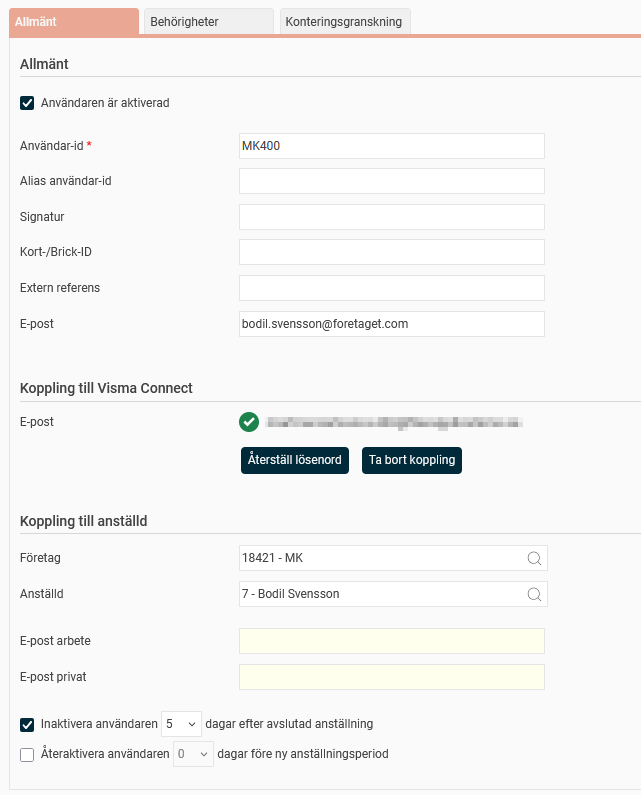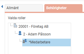 Under fliken Behörigheter anges vad användaren ska ha för behörighet i systemet. Ska den anställde endast rapportera sin egen tidrapport/reseräkning så räcker det med att spara. Då kommer systemet ge behörighet till den roll som är angiven som standardroll i HRM. I detta exempel Medarbetare.