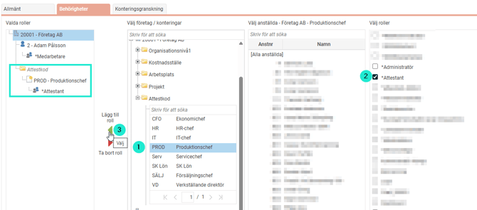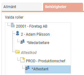 Exempel nedan visar tillägg av rollen Attesterande chef för Attestkod PROD.