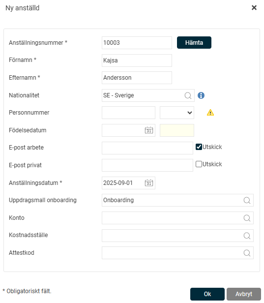 I det fönster som dyker upp anger du anställningsnummer, namn, anställningsdatum samt andra uppgifter som är relevant att registrera i systemet.
