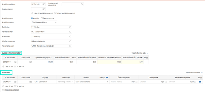 Under menyn Anställning anger du bland annat sysselsättningsgrad, tidgrupp och schema för den anställde.