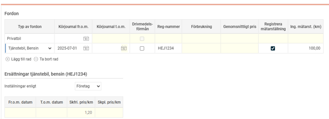 Du kan under Bilar ange vilken typ av bil den anställde har. Som standard har den anställde en privatbil, men du kan här ange om den anställde som exempel har en tjänstebil.